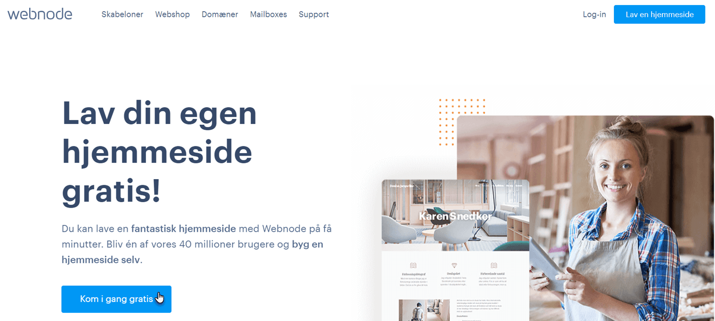 1. Gå til www.webnode.dk og klik på knappen Kom i gang.