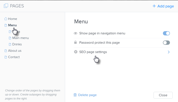 2. Vælg den side du ønsker at skjule. Klik på SEO sideindstillinger og scroll ned.