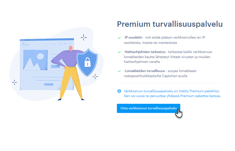 A. Jos sinulla ei vielä ole Premium pakettia, aloita tilaamalla paketti. Valitse pakettia ostettaessa verkkosivuston suojaus rastittamalla sopiva ruutu.