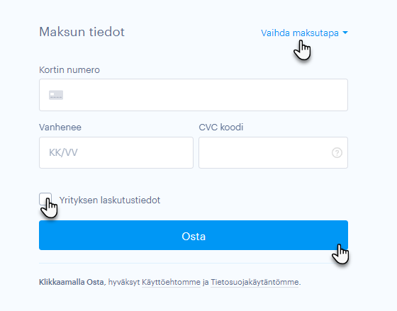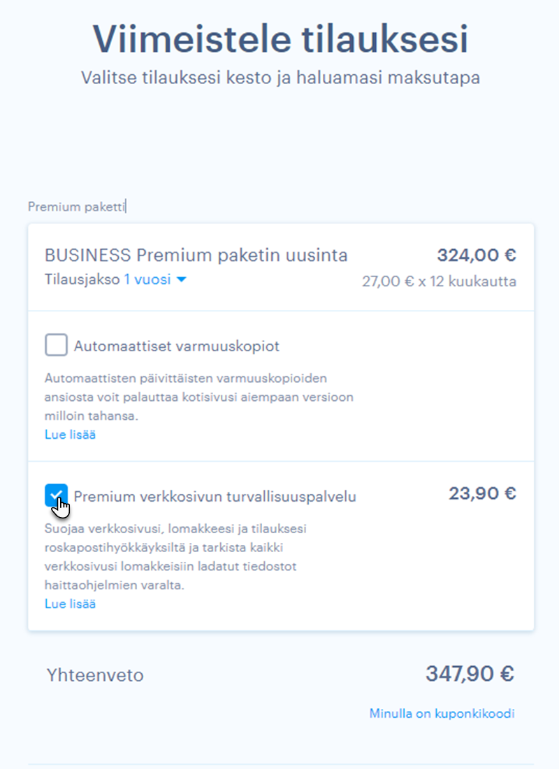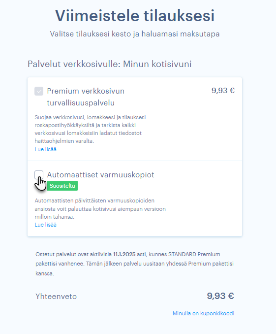 3. Tilauksen osana voit valita maksutavan, käyttää kuponkia, syöttää laskutustiedot ja halutessasi ostaa Automaattisen varmuuskopiointipalvelun.