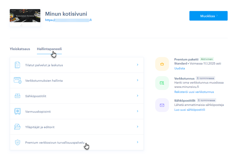 3. Projektin hallinnassa klikkaa Hallintapaneeli ja sitten Premium verkkosivun turvallisuuspalvelu.
