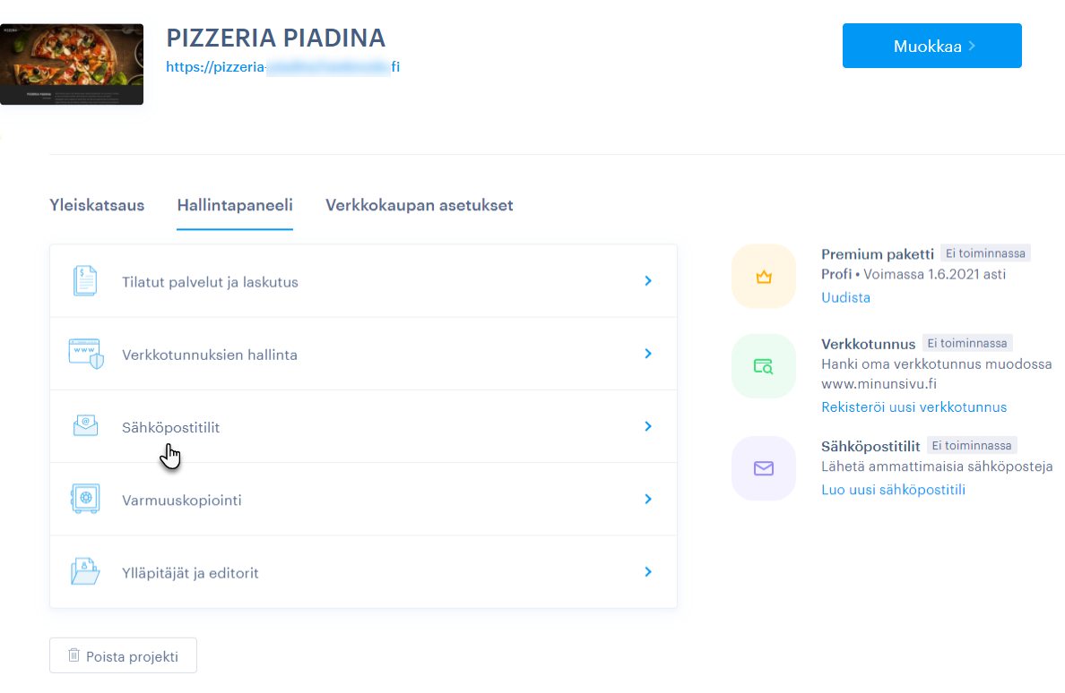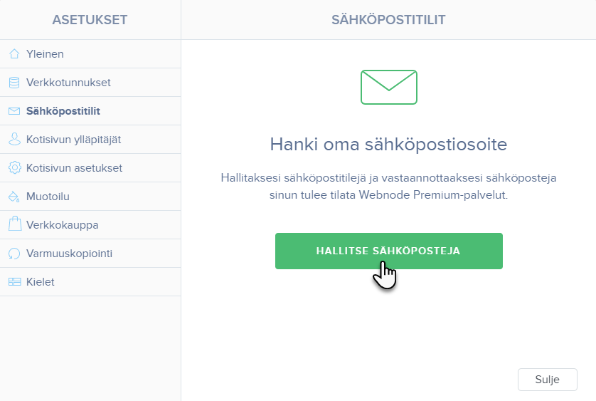 1. Voit luoda oman sähköpostiosoitteen suoraan kotisivusi editorissa, klikkaamalla ASETUKSET.