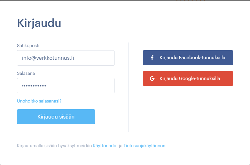 2. Kirjaudu sisään syöttämällä sähköpostiosoite jonka loit ja joka käyttää omaa verkkotunnustasi, esimerkiksi info@verkkotunnus.fi. Älä syötä sähköpostiosoitetta jota käytät sisäänkirjautumiseen kun muokkaat kotisivujasi. Kyseessä on kaksi erillistä tiliä.