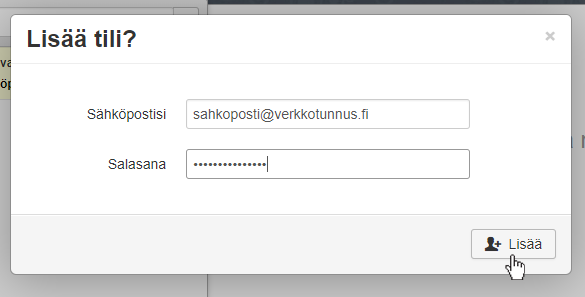 Syötä sähköpostiosoite ja tämän osoitteen salasana. Vahvista klikkaamalla Lisää.