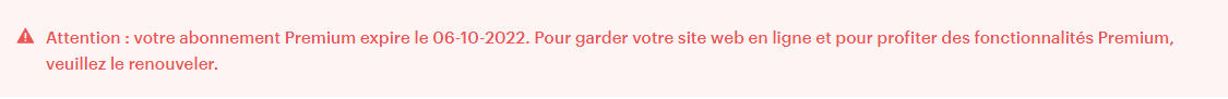ATTENTION : Si votre forfait premium ou un domaine expire prochainement, un message rouge comme celui-ci (voir image) vous sera affiché. Ici, un simple clic sur le message vous conduira à l'achat du renouvellement.