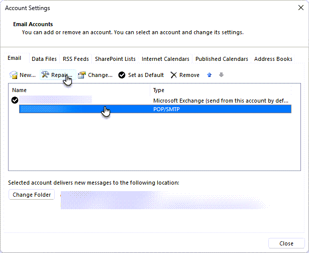 3. Choose your account and click the Repair… button.