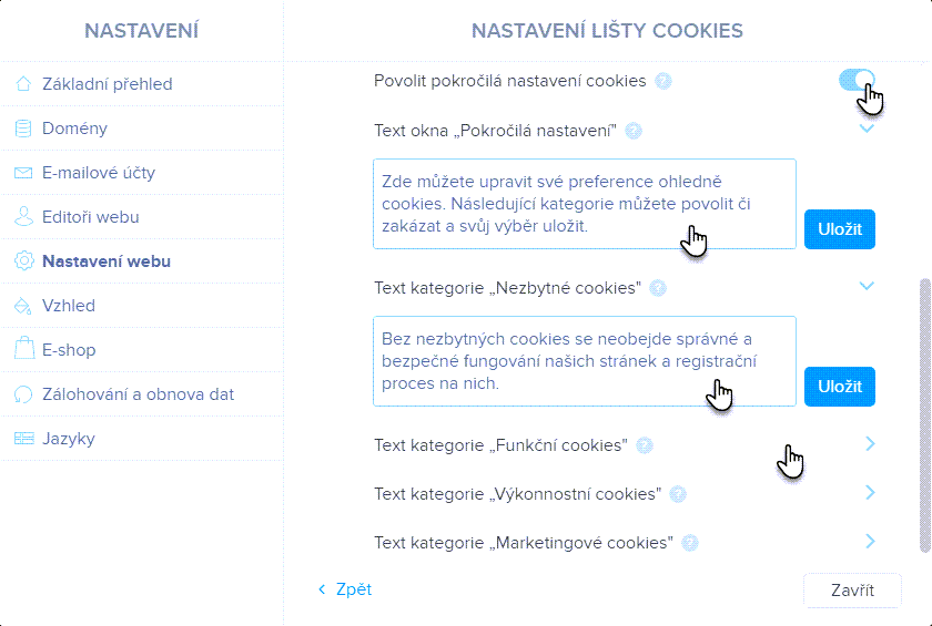 Zde můžete změnit texty pro Pokročilá nastavení. Pokud necháte políčko pro text prázdné, varianta cookies se v liště (Pokročilých nastaveních) neobjeví. Úpravu textu nezapomeňte Uložit tlačítkem.