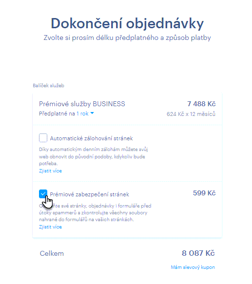 Službu Prémiového zabezpečení stránek je možné využívat pouze s balíčky prémiových služeb). Zakoupit ji můžete společně s balíčkem, nebo samostatně – pokud již balíček zakoupený máte.