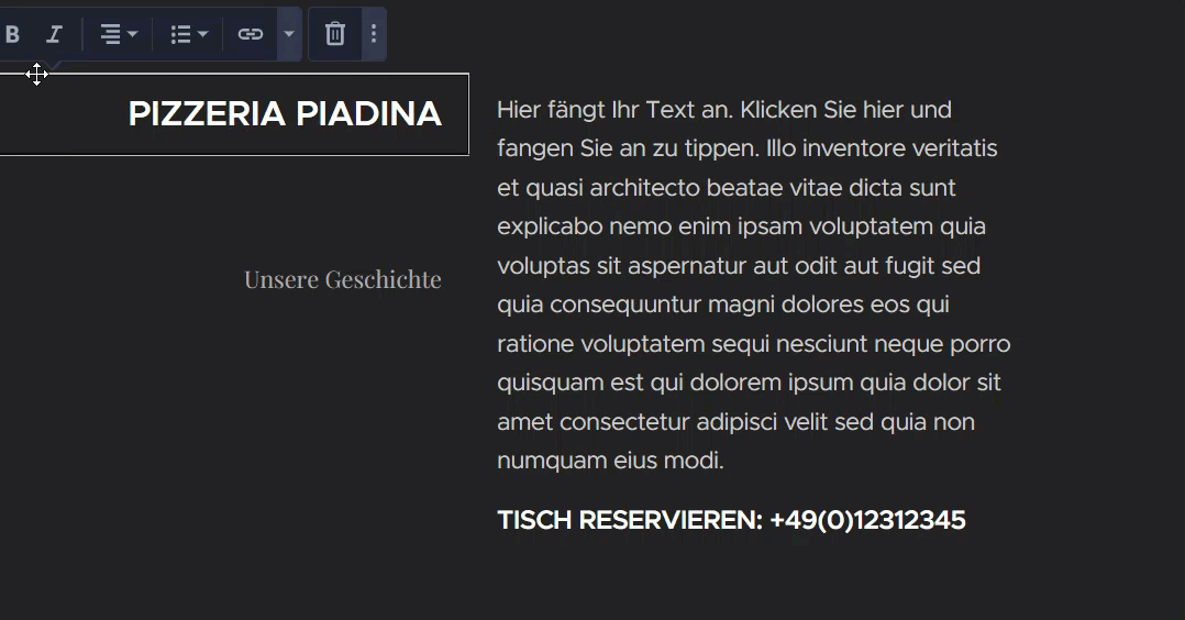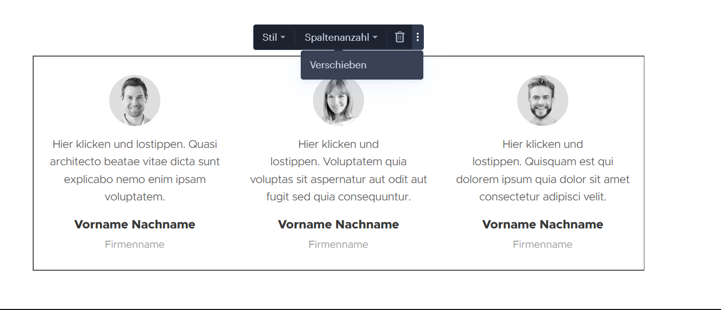 TIPP: Innerhalb des Editors wird zwischen Abschnitten und Inhaltsblöcken unterschieden. Abschnitte sind der größere Teil der Seite, ihre Einstellungen werden über das Zahnrad rechts auf der Seite gesteuert. Inhaltsblöcke sind kleinere Teile der Seite (z. B. nur ein Formular oder Text), deren Einstellungen über die Schaltfläche "drei Punkte" direkt auf dem jeweiligen Inhaltsblock gesteuert werden. Ein Abschnitt kann mehrere Inhaltsblöcke enthalten. Wenn Sie ganze Abschnitte verschieben möchten, können Sie der Anleitung Wie man einen Abschnitt verschiebt oder kopiert folgen.