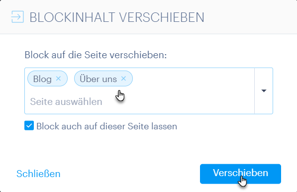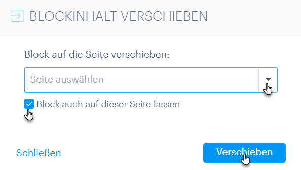 2. Wählen Sie hier die Seite aus, auf die der Inhalt verschoben werden soll. Wenn Sie die Option Block auch auf dieser Seite lassen aktivieren, wird der Block kopiert.