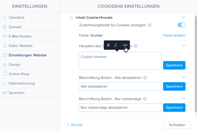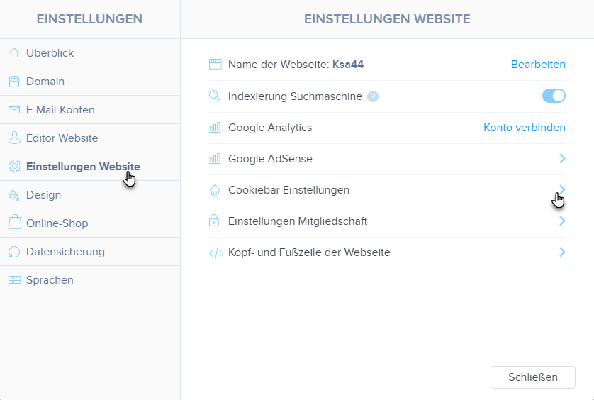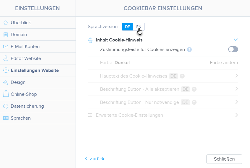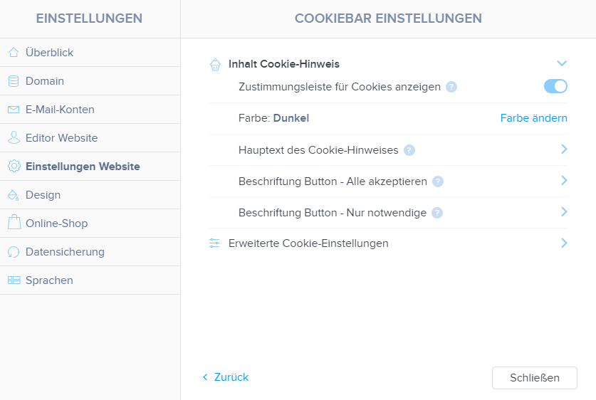 2. Klicken Sie in Einstellungen Website auf Cookiebar Einstellungen.