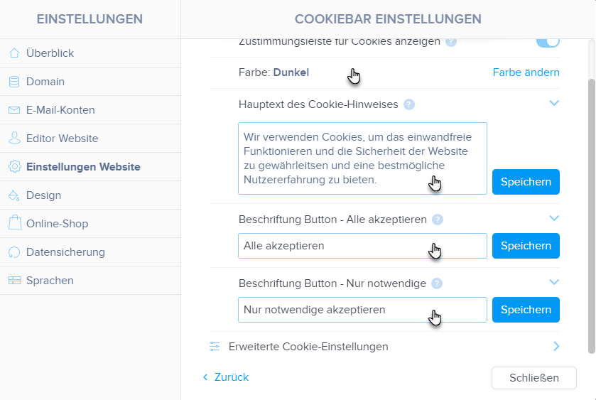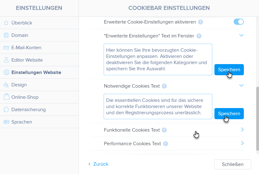 Hier können Sie die Texte für die erweiterten Einstellungen ändern. Wenn Sie das Textfeld leer lassen, wird die Cookie-Variante nicht in der Symbolleiste (Erweiterte Einstellungen) angezeigt. Vergessen Sie nicht, den Text zu speichern.