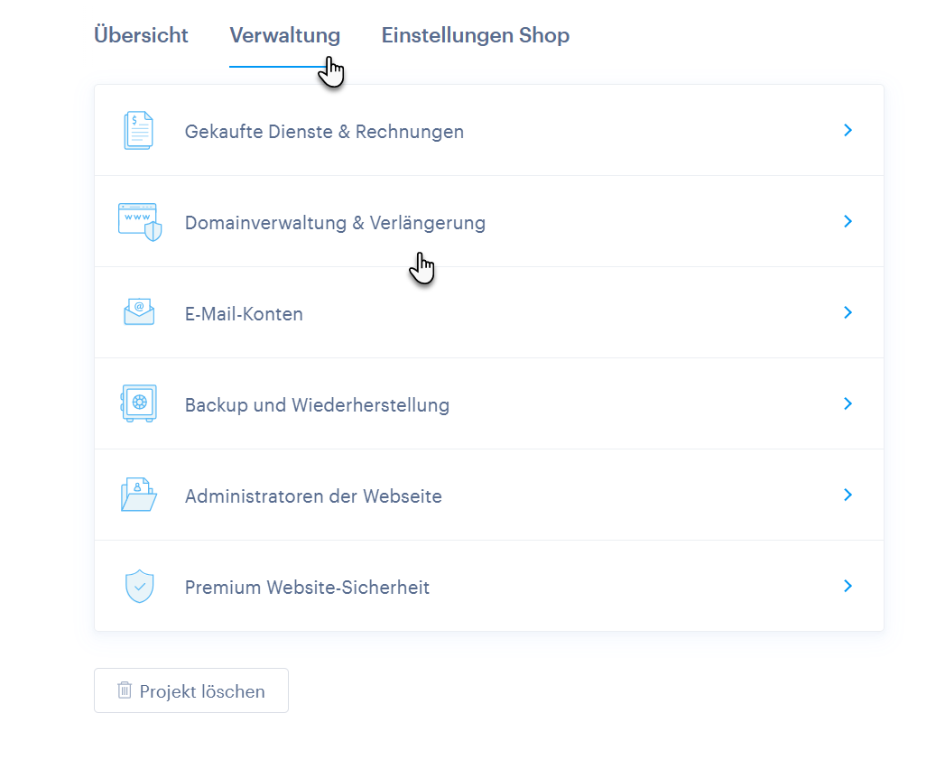 1. Öffnen Sie in Ihrer Projektverwaltung die Registerkarte Verwaltung und wählen Sie Domainverwaltung & Verlängerung.