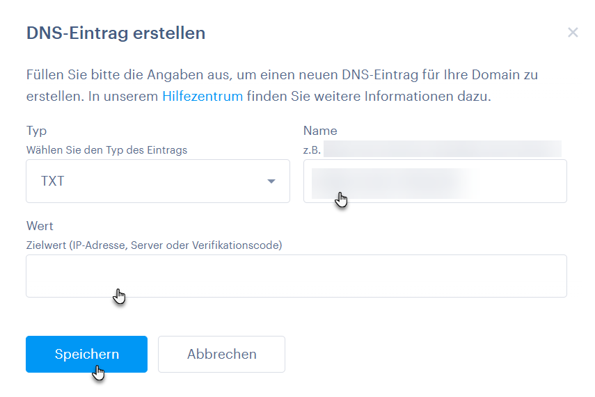 TXT-Einträge speichern Textinformationen, die häufig zur Überprüfung der Domain-Inhaberschaft oder zur Verbesserung der E-Mail-Sicherheit verwendet werden. Ein gängiges Beispiel ist die Domain-Überprüfung für Dienste wie Google Workspace oder Microsoft 365. TXT-Einträge werden auch für SPF-, DKIM- und DMARC-Einstellungen verwendet – Technologien, die zum Schutz vor E-Mail-Missbrauch beitragen. Die Werte für diese Einträge werden in der Regel von dem von Ihnen verwendeten Dienst bereitgestellt.