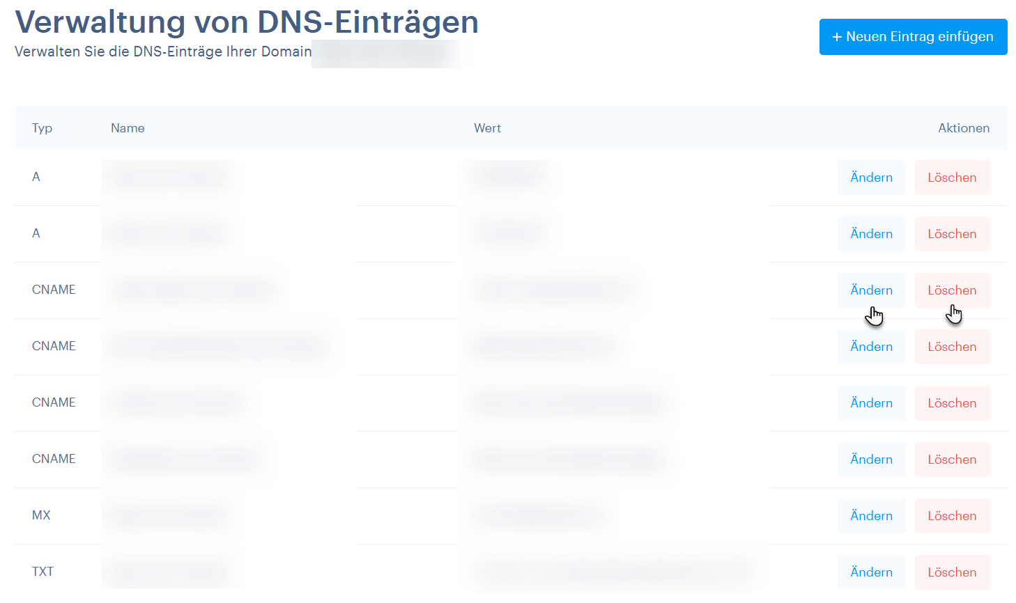 Wenn Sie andere Arten von Einträgen ändern müssen, die nicht in der Verwaltung aufgeführt sind, oder wenn Sie eine neue Subdomain aus Ihrer eigenen Domain erstellen möchten (z. B. shop.ihredomain.com), wenden Sie sich bitte an unseren Kundensupport.