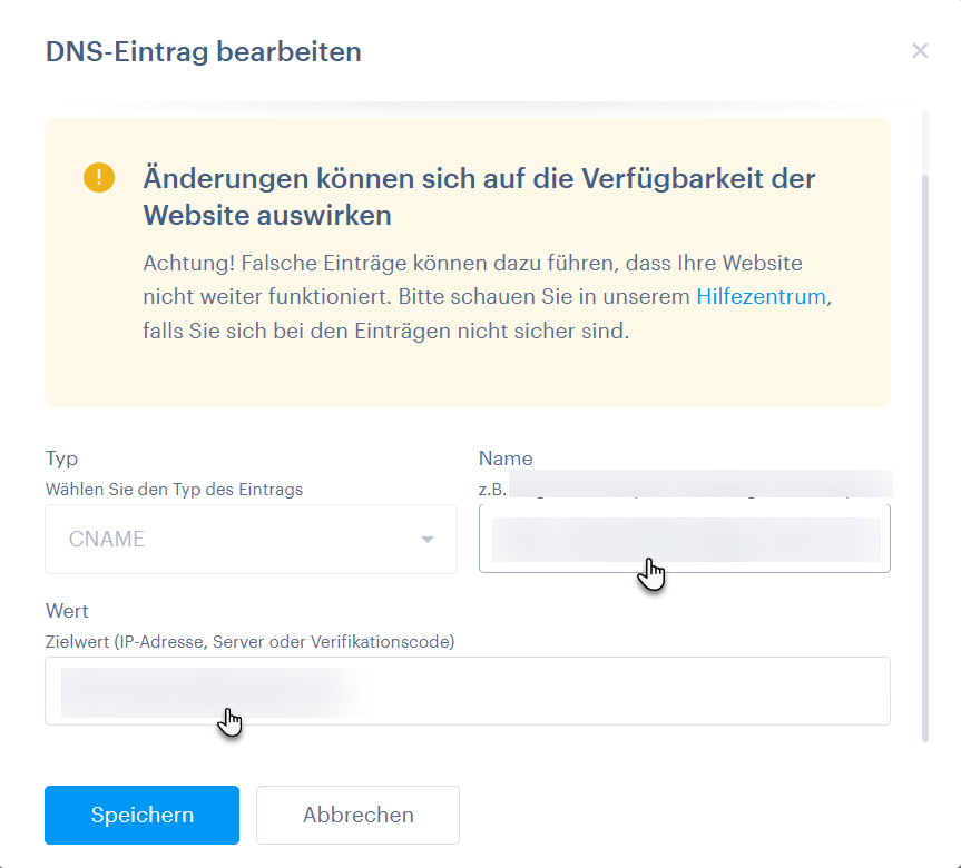 ACHTUNG: Das Ändern vorhandener DNS-Einträge kann sich auf die Funktionsweise Ihrer Website auswirken. Wenn Sie falsche Werte eingeben, funktioniert Ihre Website möglicherweise nicht mehr. Webnode kann in solchen Fällen keine korrekte Funktionalität garantieren. Wir empfehlen daher, Änderungen nur vorzunehmen, wenn Sie ein/-e erfahrener/-e Benutzer/-in sind.