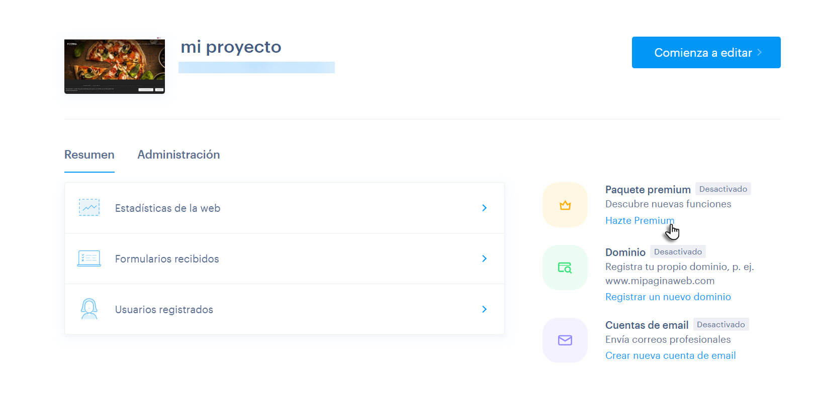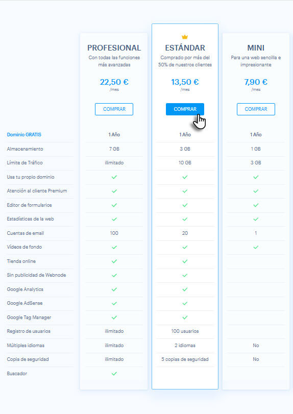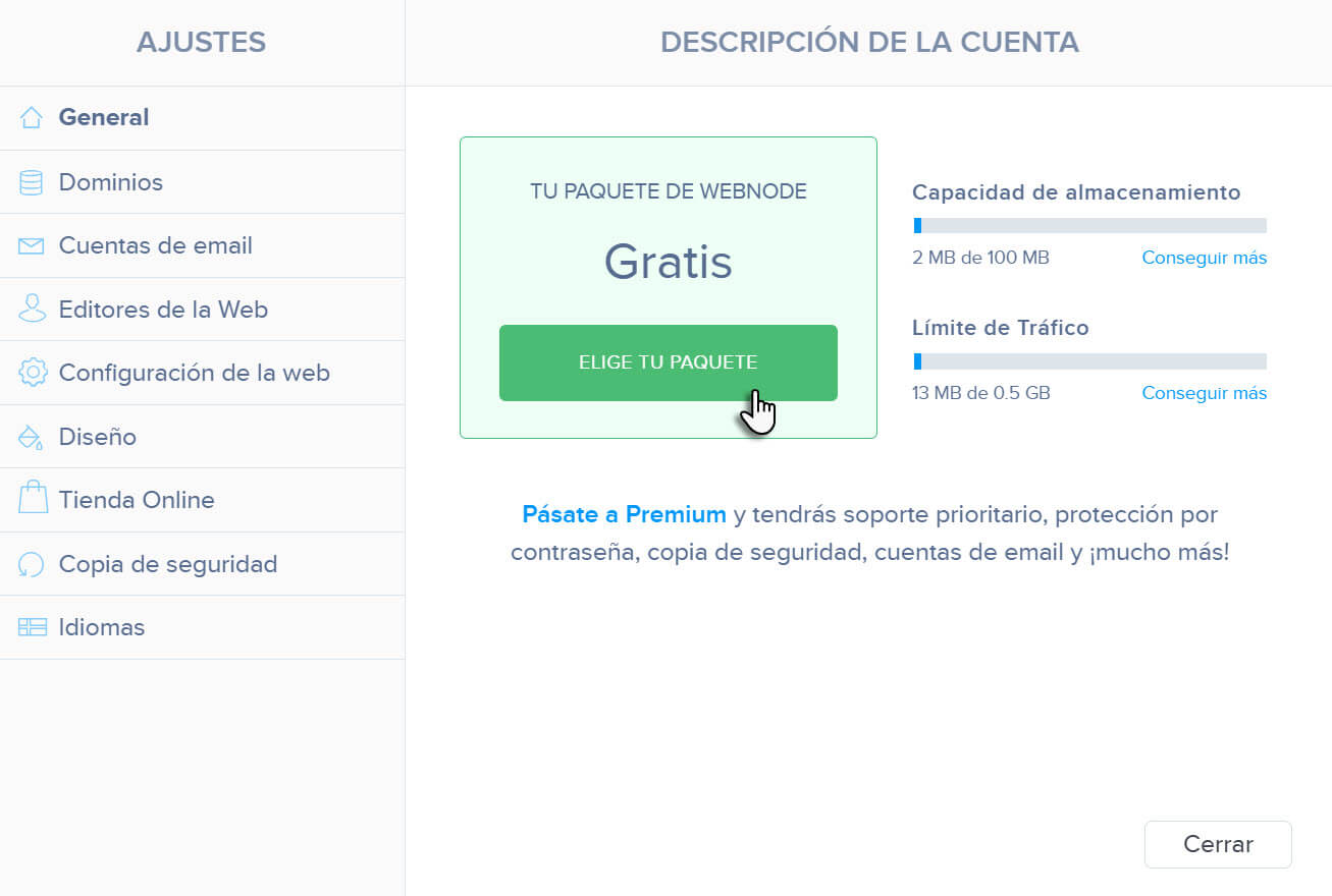 SUGERENCIA: Cuando adquieras por primera vez un paquete Mini, Estándar, Profesional o Business, recibirás un email con un cupón que te permitirá registrar un dominio gratis durante un año. Los servicios Premium se activarán automáticamente.