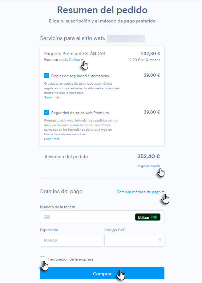 5. Elige el tiempo por el cual deseas abonar el servicio, y el método de pago. También puedes añadir un servicio adicional (copias de seguridad automáticas y seguridad de sitios web Premium). En caso de que tengas un cupón de descuento, marca la opción Tengo un cupón y escribe el código. Confirma y activa el cupón haciendo clic en Canjear cupón. Si deseas rellenar los datos de facturación, por favor, marca la casilla Facturación de la empresa.