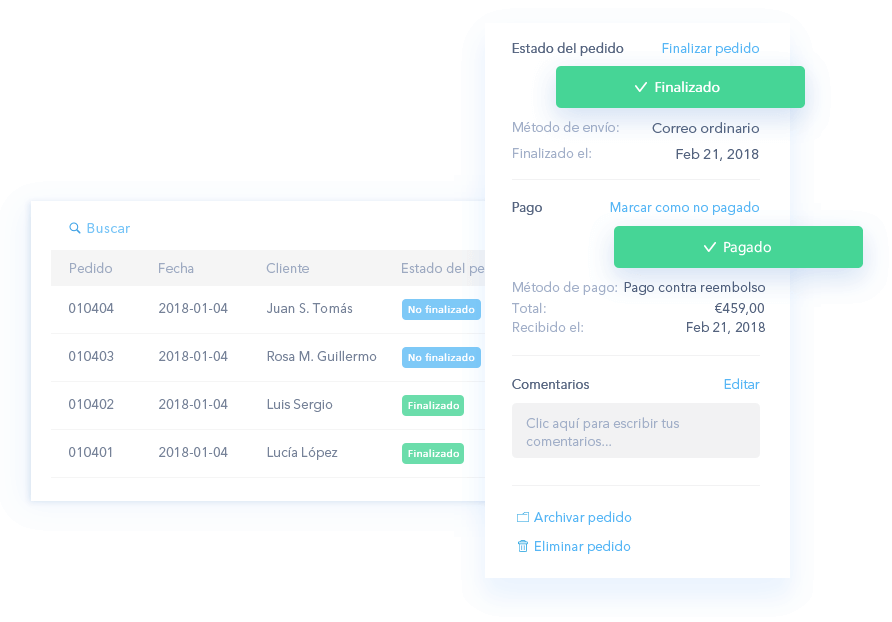 Ofrece a tus clientes pagar con tarjeta de crédito, PayPal o transferencia. Comprueba el estado de tus pedidos, cuáles se han pagado o cuántos hay que enviar.