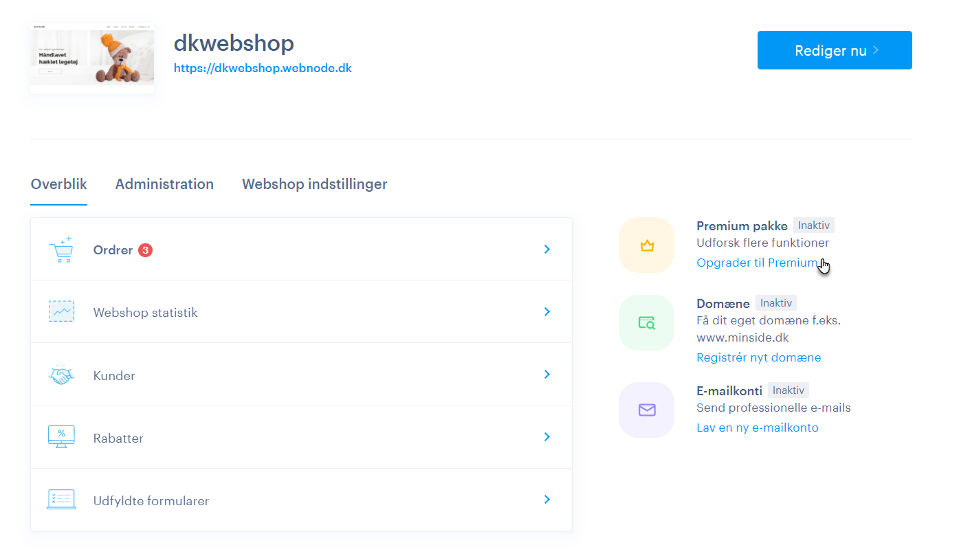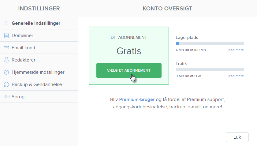 2. Du kan ligeledes bestille Premium-tjenester via web-editoren ved at klikke på INDSTILLINGER.