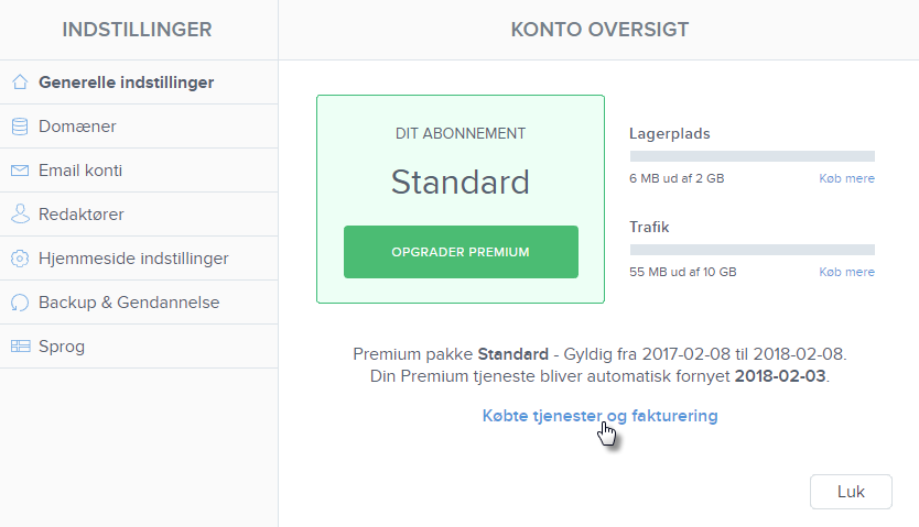 3. Du kan også få adgang til fakturaerne fra dit websteds redaktør ved at klikke på INDSTILLINGER.