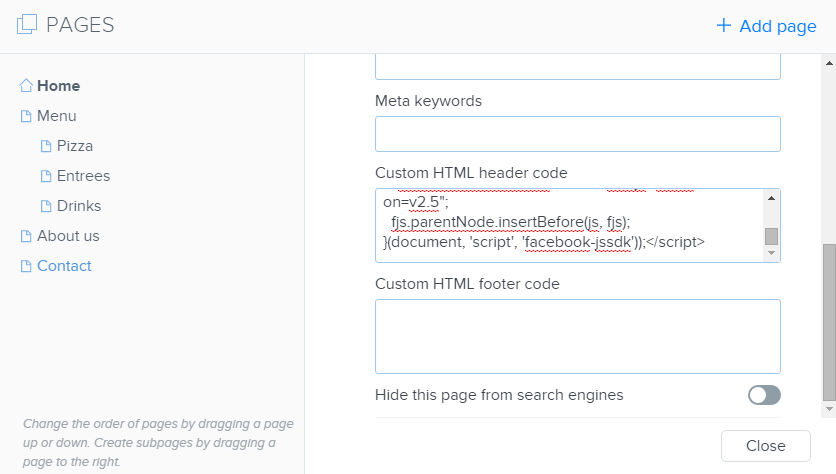 4. Indtast den første stykke kode i Brugerdefineret HTML sidehoved-kode.
