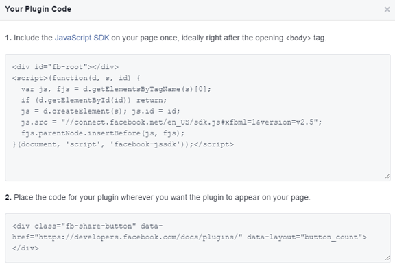 1. På siden Facebook for Developers, vælg den type widget du ønsker at tilføje. Du vil modtage to sæt kode.
