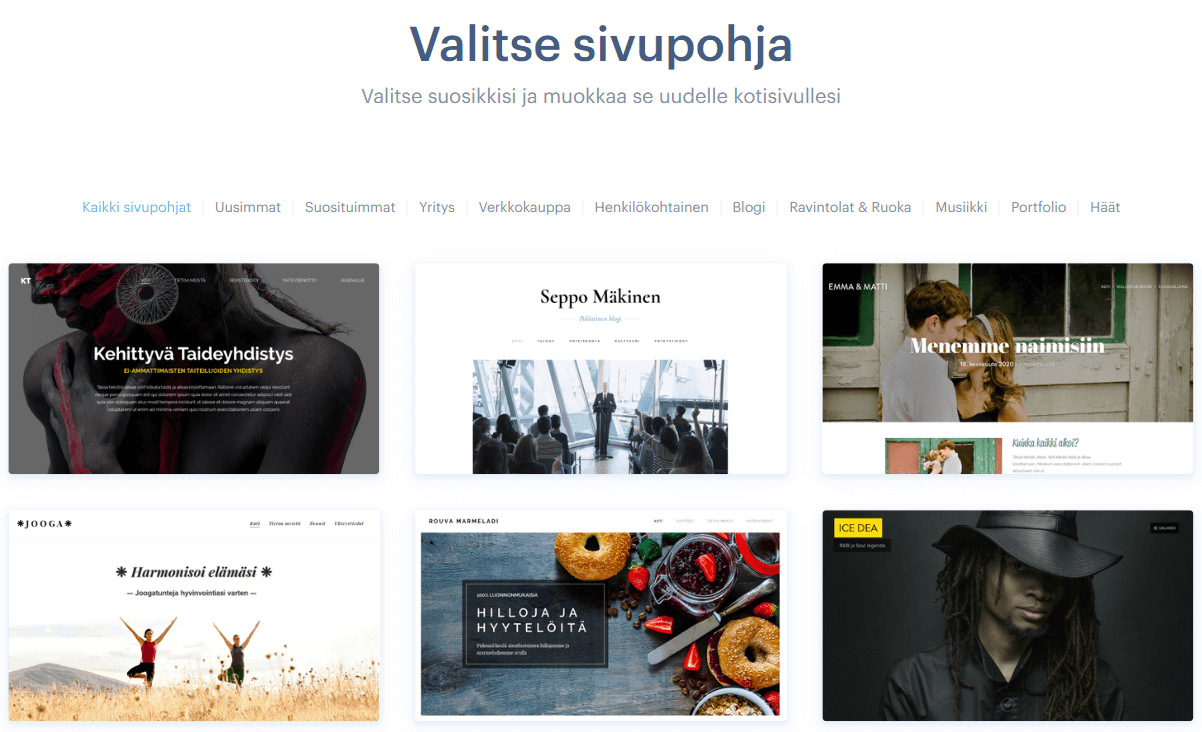 Vinkki:  Teknisistä syistä johtuen sivupohjaa ei ole mahdollista vaihtaa sen jälkeen kun se on valittu. Jos sinun tarvitsee vaihtaa sivupohja, joudut luomaan uuden kotisivun ja siirtämään manuaalisesti sisällön vanhalta kotisivulta uudelle kotisivulle.