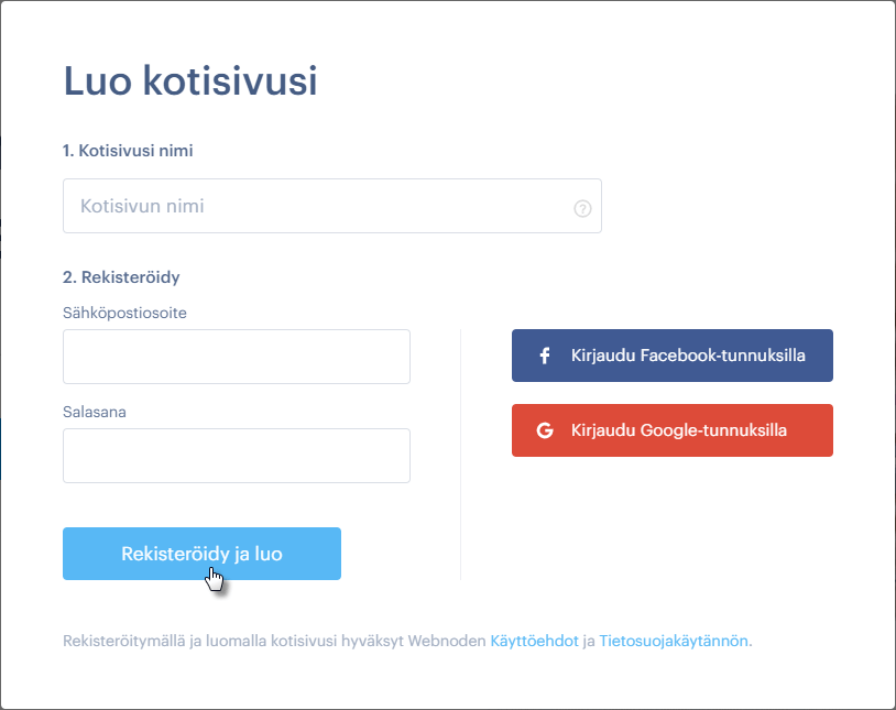 2. Syötä kotisivun nimisähköpostiosoite ja salasana. Klikkaa Rekisteröidy ja luo.