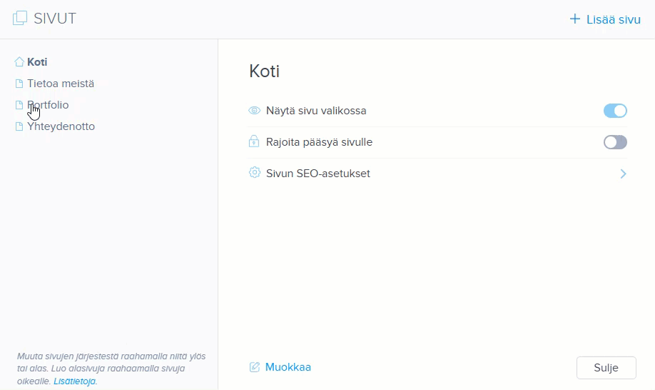 Klikkaa SIVUT.Voit luoda alasivuja klikkaamalla ja vetämällä sivun oikealle ja pitämällä sen pääsivun alla.Julkaise muutokset.Vinkki: Samalla tavalla voit myös muuttaa sivujen järjestystä.