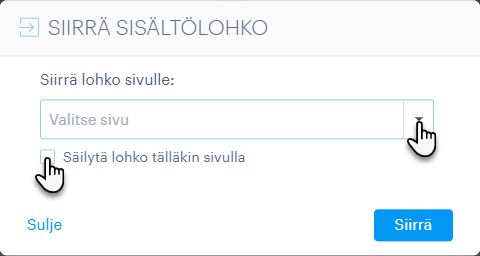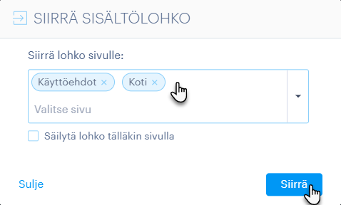 2. Valitse tässä sivu, johon sisältö siirretään. Valitsemalla vaihtoehdon Säilytä lohko myös tälläkin sivulla, lohko kopioidaan.