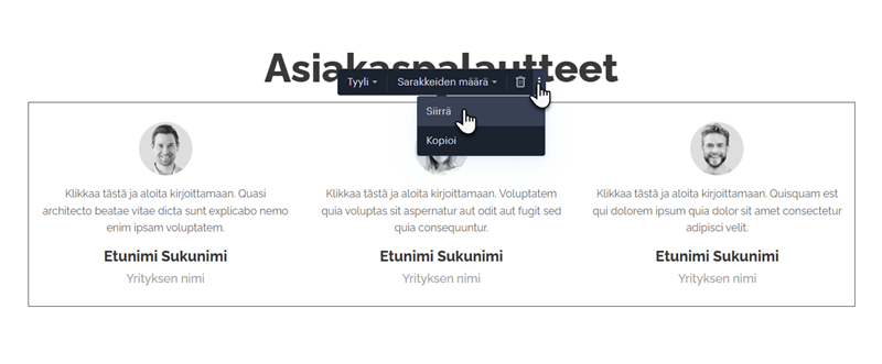 VINKKI: Osiot ja sisältölohkot eroavat toisistaan editorissa. Osiot ovat sivun laajempi osa, niiden asetuksia ohjataan sivun oikealla puolella olevalla hammaspyörällä. Sisältölohkot ovat sivun pienempiä osia (esimerkiksi vain lomake tai teksti), joiden asetuksia ohjataan suoraan kyseisen sisälohkon päällä olevalla "kolme pistettä" -painikkeella. Yksi osio voi sisältää useita sisältölohkoja. Jos haluat siirtää kokonaisia osioita, voit noudattaa ohjeita Kuinka siirrän tai kopion osion.