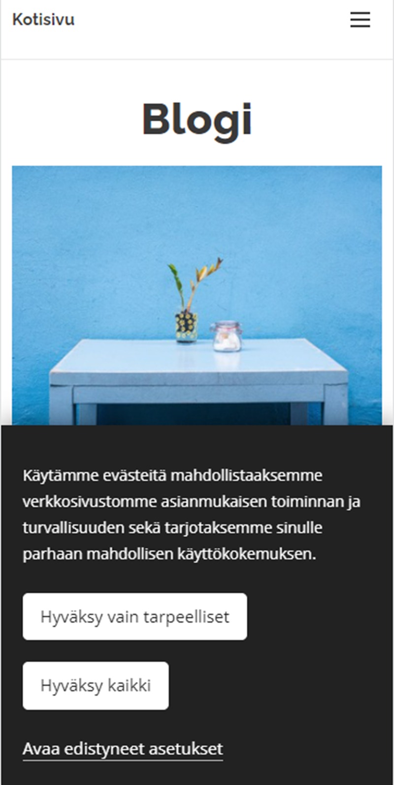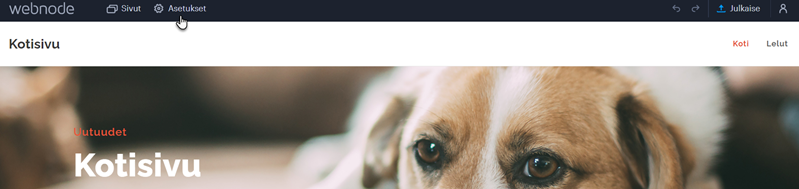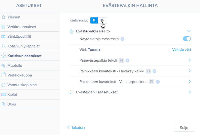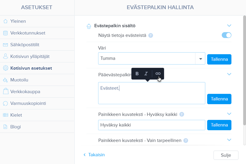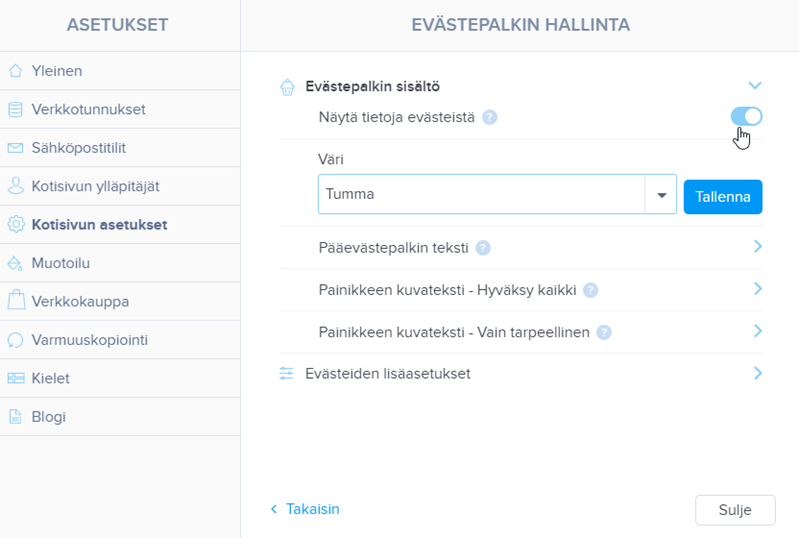 Väri-osiossa voit määrittää tumman tai vaalean väriteeman. Muissa kentissä määrität sitten pääpalkin tekstin sanamuodon ja evästeiden hyväksymispainikkeet. Muista tallentaa muutokset Tallenna-painikkeella.