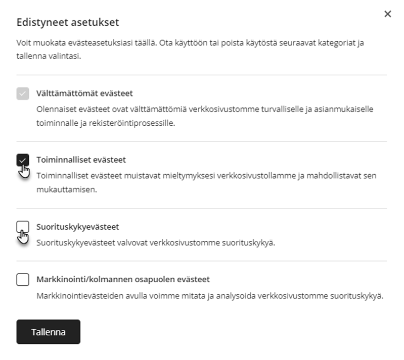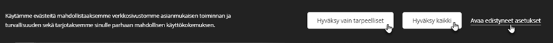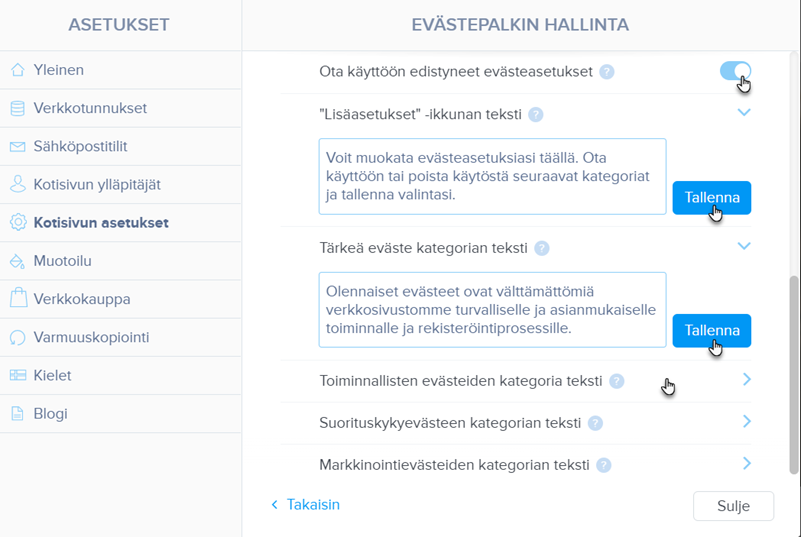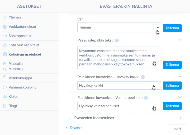Täällä voit muuttaa Lisäasetusten tekstejä. Jos jätät tekstikentän tyhjäksi, evästeversio ei näy (Lisäasetukset) -työkalupalkissa. Muista tallentaa muutokset Tallenna-painikkeella.