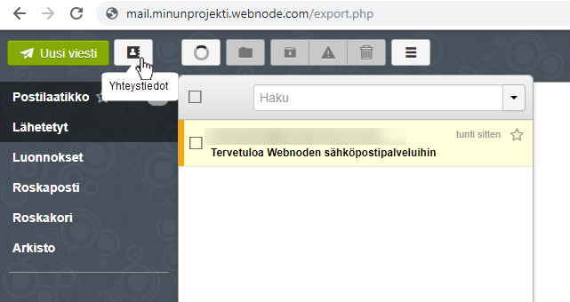 Yhteystietoluetteloa on mahdollista ladata csv/vcf/vCard -tiedostomuodossa. Lataa tiedosto webmailiin klikkaamalla Yhteystiedot-kuvaketta (ylävasen).