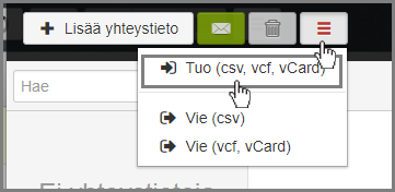 Klikkaa valikkoa oikealla ja valitse Tuo (csv, vcf, vCard)