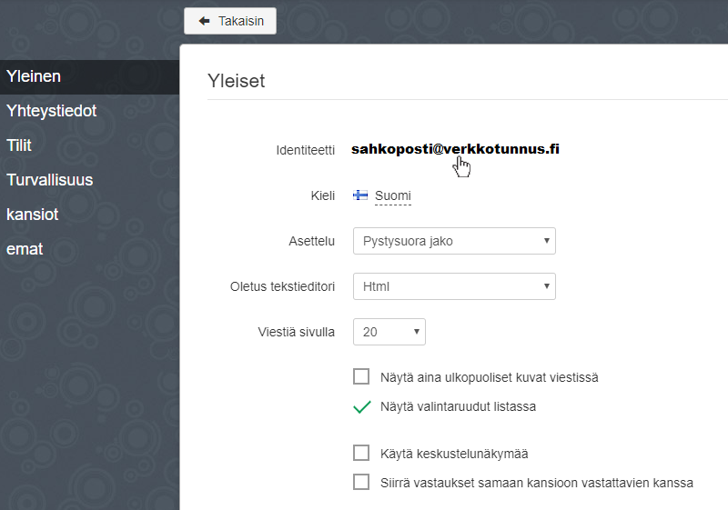 Pystyt muuttamaan postilaatikon ulkoasua klikkaamalla oikeassa yläkulmassa olevaa tilikuvaketta ja valitsemalla Asetukset (katso edellä). Klikkaamalla Teemat-välilehden valitset haluamasi ulkoasun. Voit ladata omankin kuvan tietokoneeltasi klikkaamalla Lataa taustakuva.