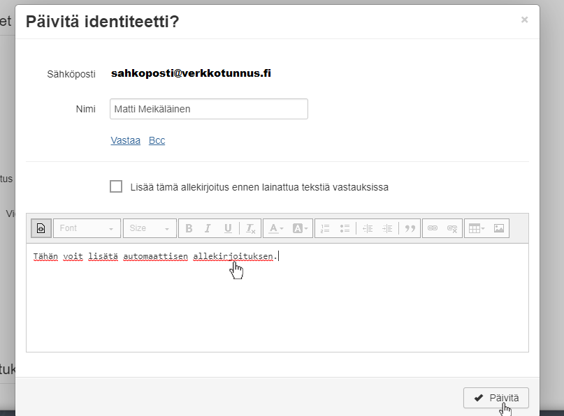 Syötä seuraavassa vaiheessa nimi sekä automaattinen allekirjoitus, jotka näytetään viestien vastaanottajille. Voit myös lisätä linkin tai kuvan allekirjoitukseen. Vahvista muutokset klikkaamalla Päivitä.