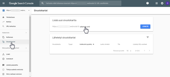 1. Klikkaa "Sivustokartat" sivulla "Hallintapaneeli". Kirjoita sitemap.xml kotisivusi URL-osoitteen perään ja klikkaa Lähetä.