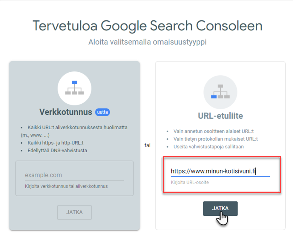 Syötä palveluun jokainen osoite erikseen. Kun olet syöttänyt kotisivusi osoitteen, klikkaa Jatka.