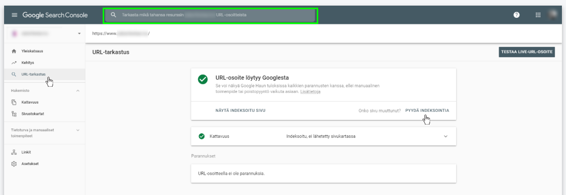 Tämä työkalu antaa sinulle yksityiskohtaisia tietoja sivustosi indeksointitilasta. Samalla voit indeksoida uudelleen koko sivuston tai tietyn sivun. Tämä on hyödyllinen vaihtoehto, kun muokkaat sivun sisältöä ja tarvitset sivuston päivitetyn version näkymään Googlessa mahdollisimman pian. Jotta voisit käyttää tätä työkalua, sivustosi pitää olla jo tarkistettu Google Search Consolessa (katso ohjeet yllä).