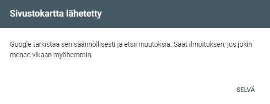 2. Esiin ilmestyy viesti, jossa sanotaan että sivustokartta on onnistuneesti lähetetty.