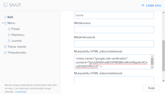 6. Lisää Google Search Console seurantakoodi kohtaan Mukautettu HTML ylätunnistekoodi.