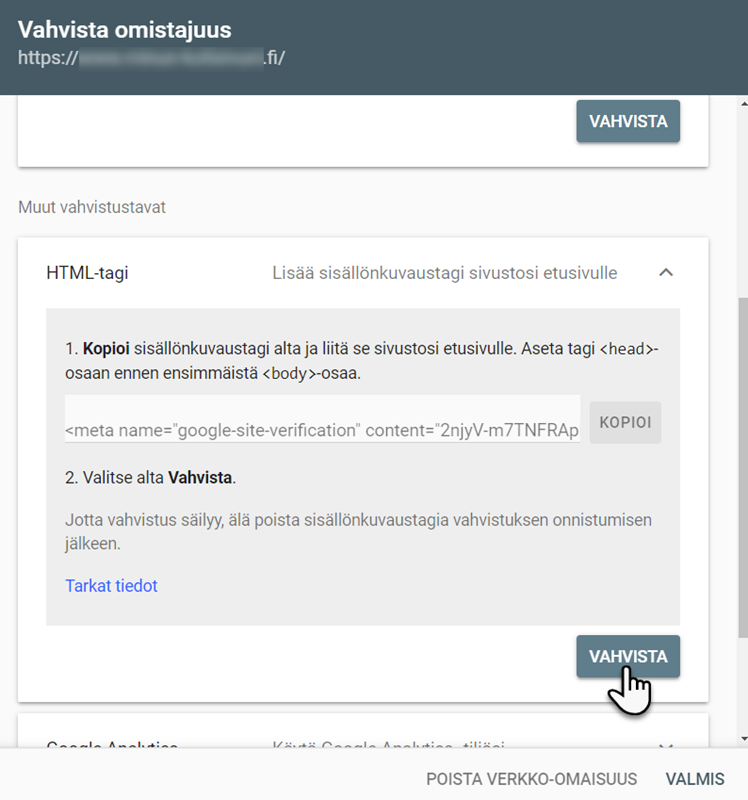 8. Avaa sen jälkeen Google Search Console ja Klikkaa Vahvista