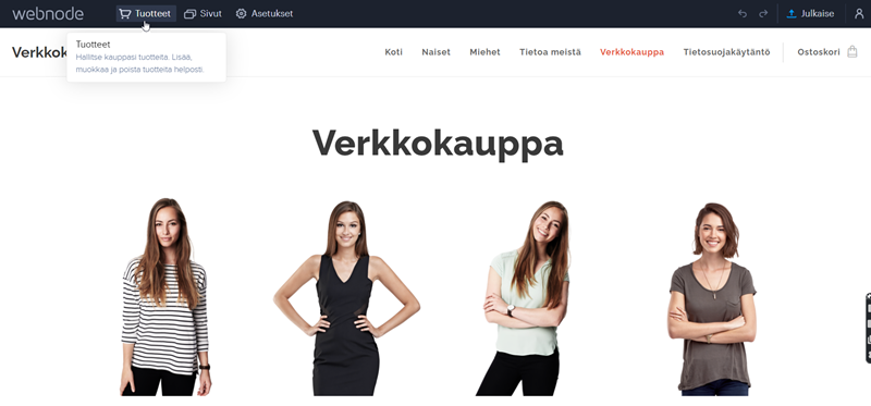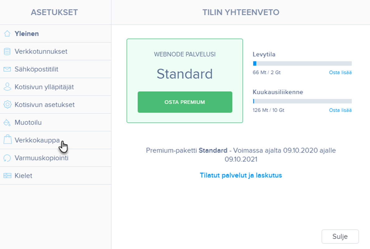 4. Verkkokauppatoiminto lisätään kotisivullesi automaattisesti ja voit alkaa myymään heti. Suosittelemme että luet artikkelit Verkkokauppasi yhdellä silmäyksellä ja Perusasetukset, joista löydät kaiken tärkeän tiedon liittyen verkkokauppasi avaamiseen.