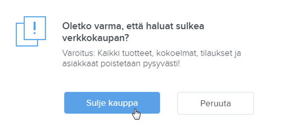 4. Vahvista kaupan sulkeminen klikkaamalla Sulje kauppa. Verkkokauppaominaisuuden pois päältä kytkeminen on peruuttamaton muutos ja kaikki verkkokauppasisisältö, mukaan lukien tilaukset ja lista asiakkaista, poistetaan lopullisesti.