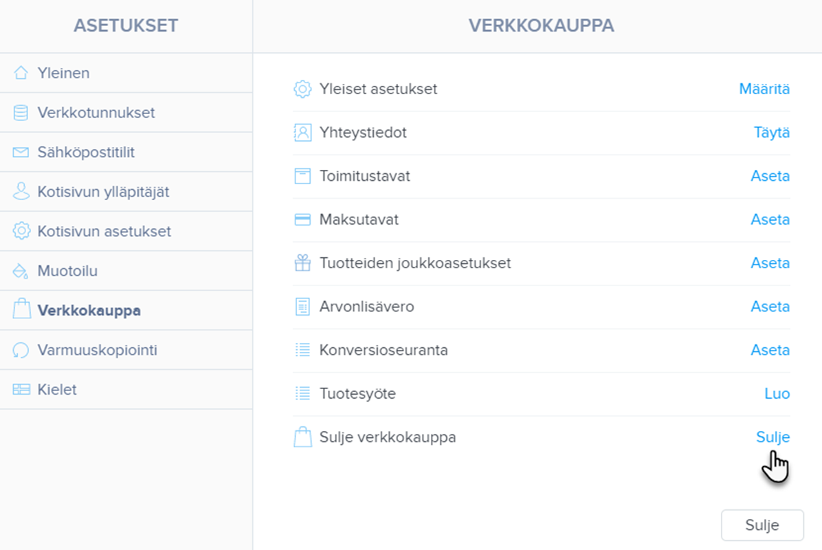 3. Kohdassa Sulje verkkokauppa klikkaa Sulje.