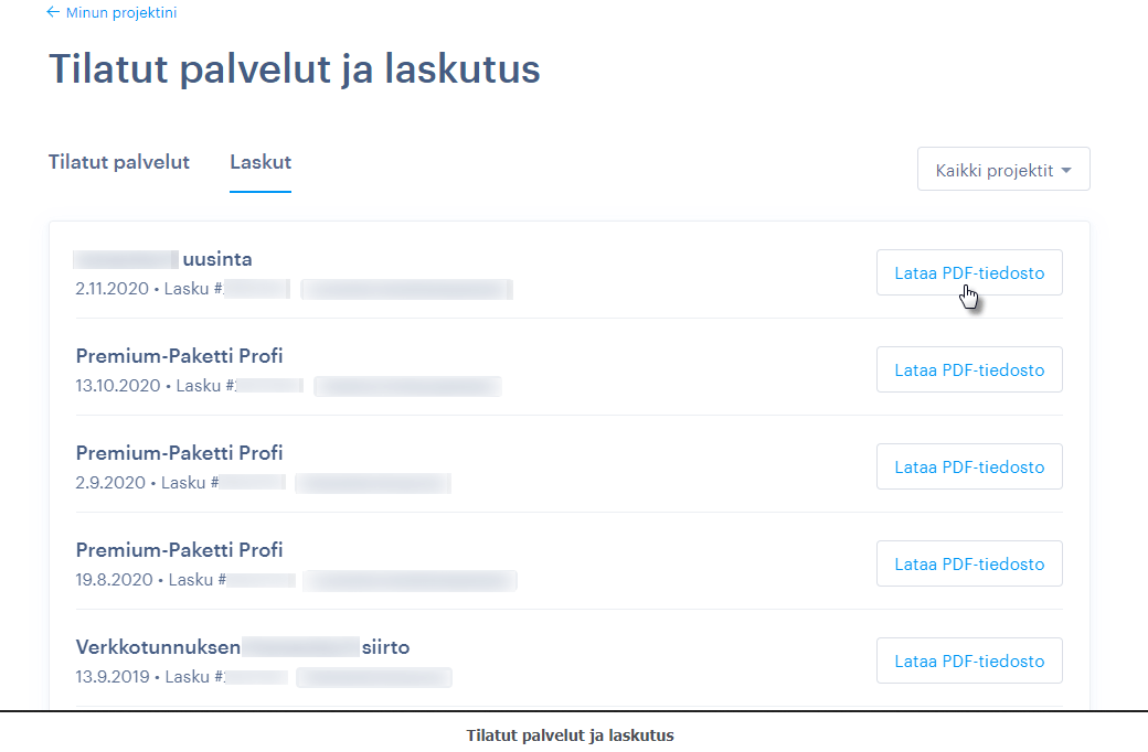 2. Klikkaa auki Tilatut palvelut ja laskutus -välilehti. Valikossa näet lueteltuna kaikki projektisi. Valitse projekti, jonka kuitin haluat ladata.