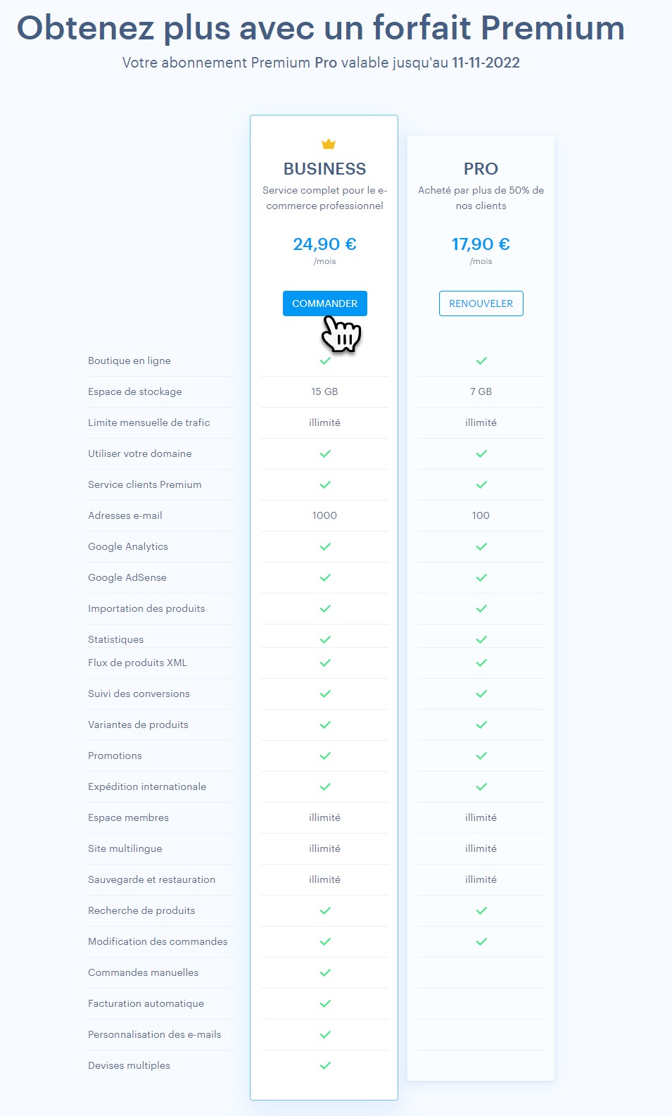 CONSEIL :  Si vous ne savez pas quel forfait choisir, nous vous recommandons de commencer par le forfait Mini. Toutefois, si vous commencez une boutique en ligne, nous vous recommandons le forfait Standard pour que la boutique en ligne soit opérationnelle. Vous trouverez ici la liste des prix pour les sites classiques, et ici pour  les tarifs de boutique en ligne. Selon les besoins requis, le forfait premium peut être mis à niveau à tout moment.