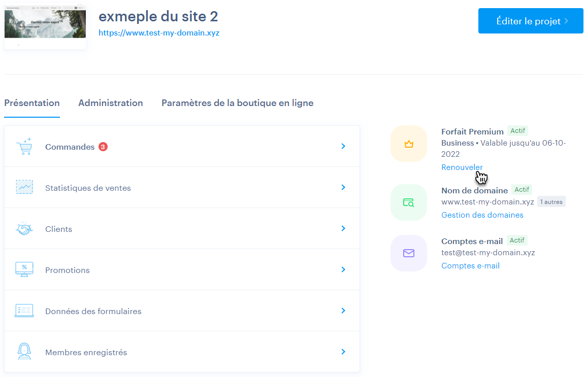 1.  La première option pour renouveler ou mettre à niveau votre forfait premium, sera de vous connecter à Webnode avec votre propre compte. Lorsque vous cliquez sur la vignette du projet, vous verrez l'aperçu du projet (voir image ci-dessous).